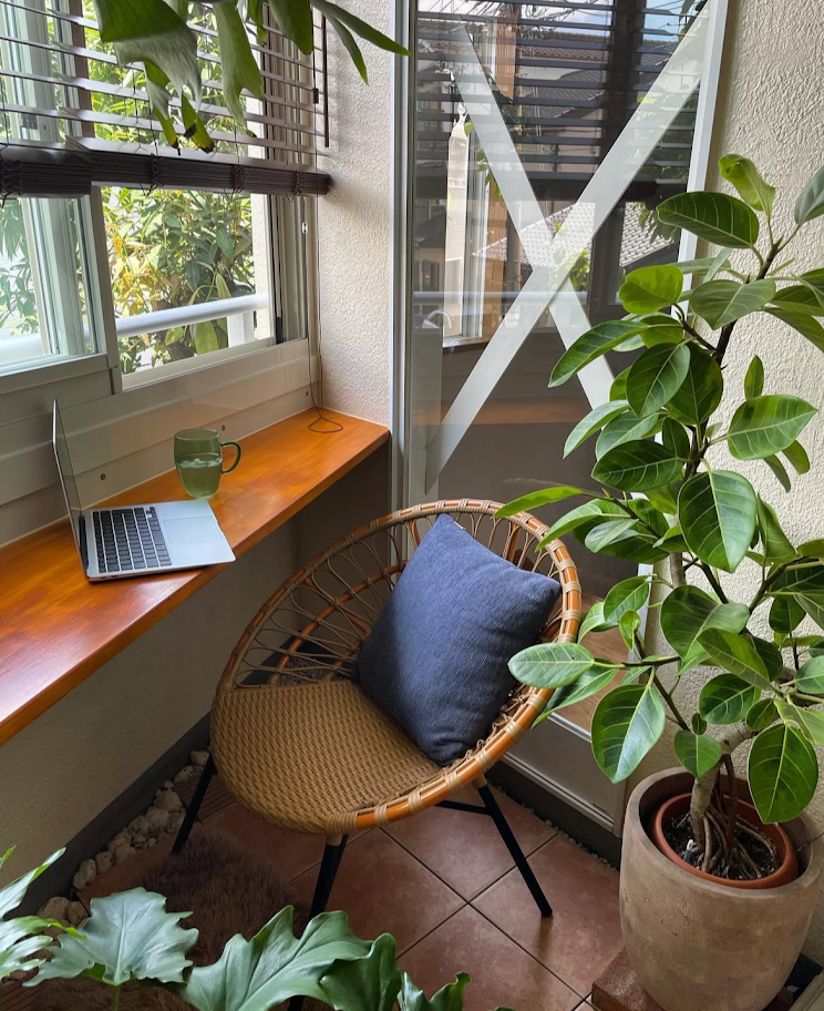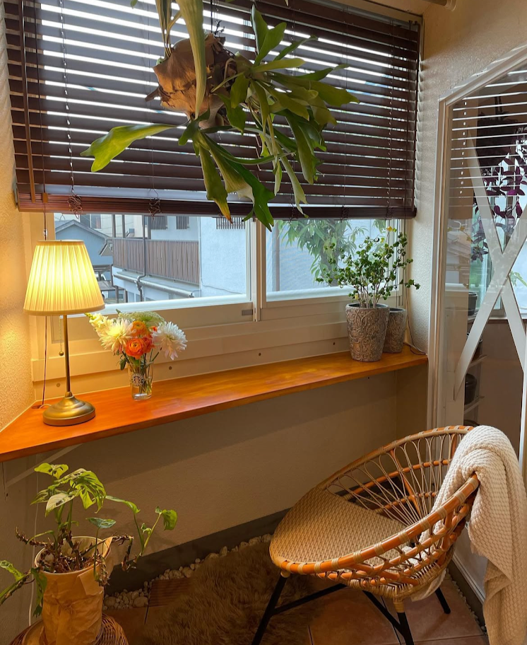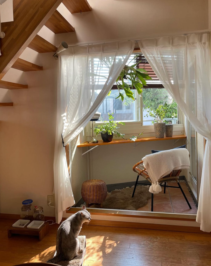 バルコニーからサンルームへのリフォームははやわらかい光が入る心地よい空間で、読書をしたり、愛猫がひなたぼっこを楽しむお気に入りの場所になっています。